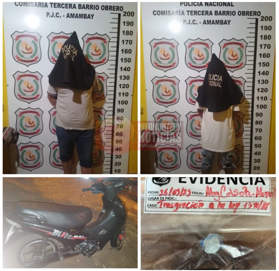 La Comisaría Tercera de Pedro Juan Caballero informó sobre la aprehensión de dos personas por supuesta tenencia de estupefacientes (cocaína), exposición a peligro del tránsito terrestre y la incautación de la citada sustancia y una motocicleta. El hecho ocurrió en la noche del lunes (26), aproximadamente a las 20:30 horas.